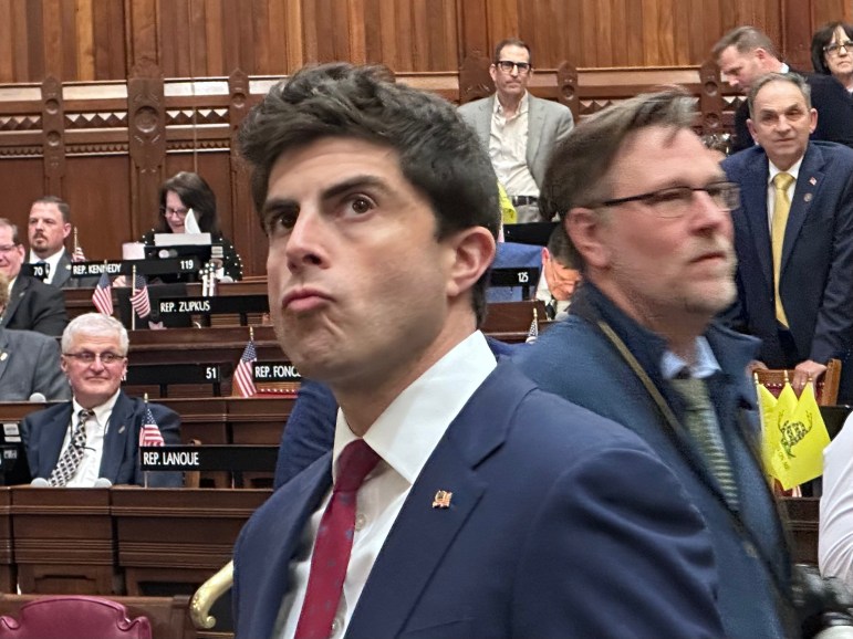 Rep. Matt Blumenthal’s reaction as debate over his bill ended without a vote. Credit: mark pazniokas