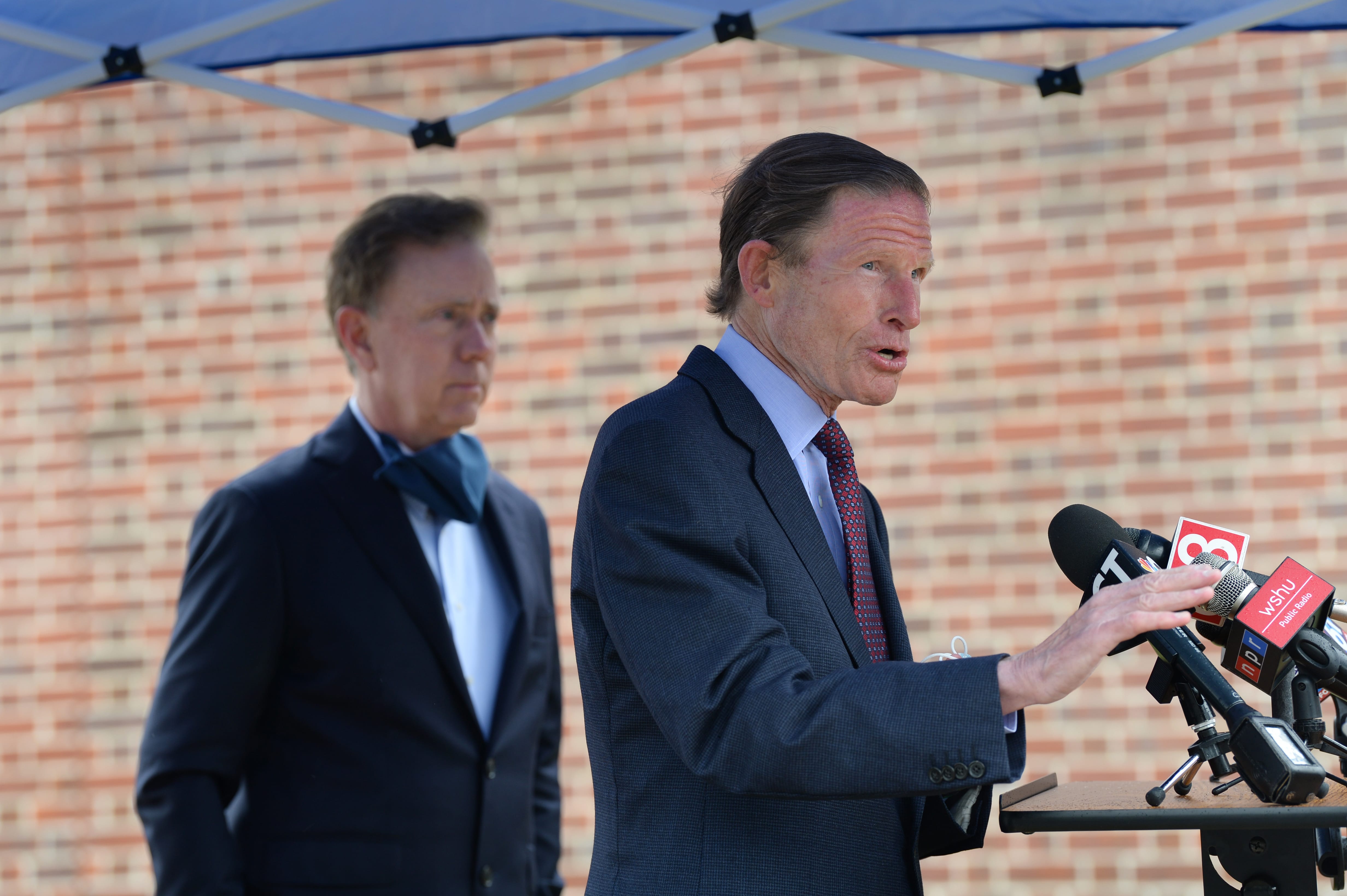 Sen. Richard Blumenthal speaks at a press conference at a Red Cross blood drive at the Connecticut Police Academy in Meriden. Gov. Ned Lamont (left) and Lt. Gov. Susan Bysiewicz (off camera) also attended the event. The purpose of their visit was to encourage residents who are healthy to donate blood. Credit: Cloe Poisson / CTMirror.org