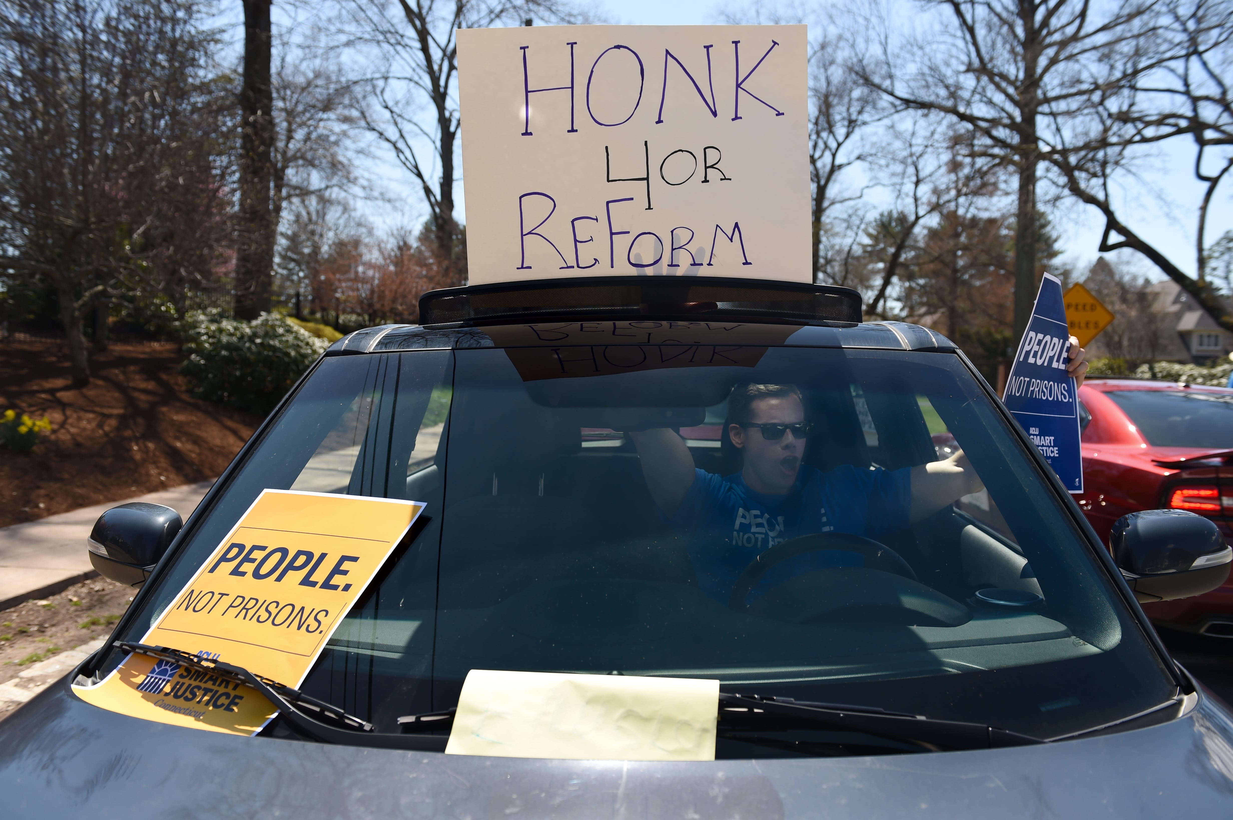 Gus Marks-Hamilton, of Farmington, representing the ACLU Smart Justice Campaign, chants and holds signs while participating in an in-car protest staged in front of the governor’s mansion in Hartford in April 2020. The protesters were calling on Gov. Ned Lamont to release prisoners under threat from the COVID-19 outbreak. Credit: Cloe Poisson / CTMirror.org