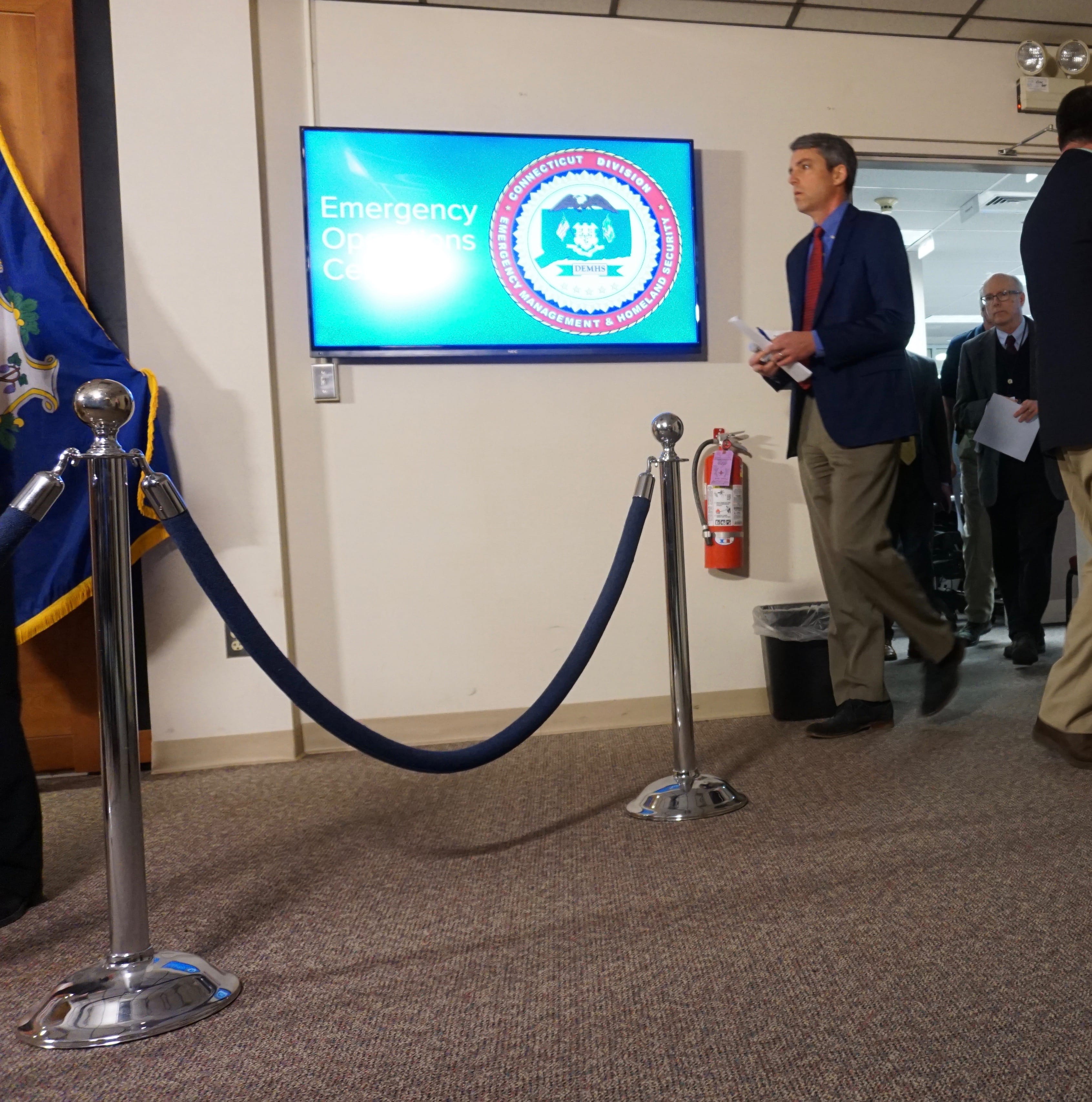 Josh Geballe, the governor’s chief operating officer, walks into the Emergency Operations Center to brief the media on Coronavirus. He is trailed by Dr. Mathew Carter, the state’s chief epidemiologist. Credit: Jacqueline Rabe Thomas / CtMirror.org