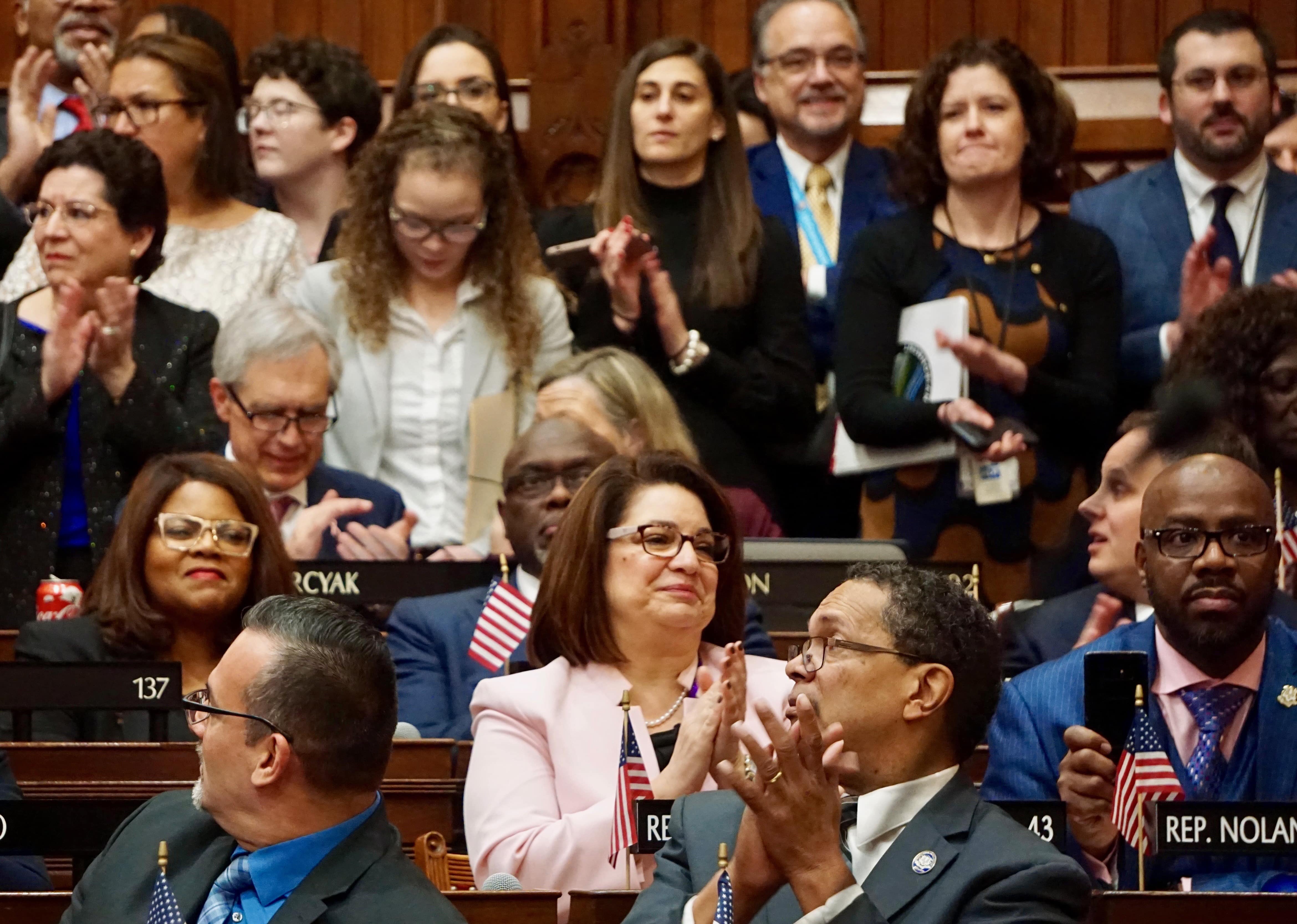 Lawmakers applauding for the governor on opening day of the 2020 legislative session. Credit: Jenna Carlesso / CT Mirror