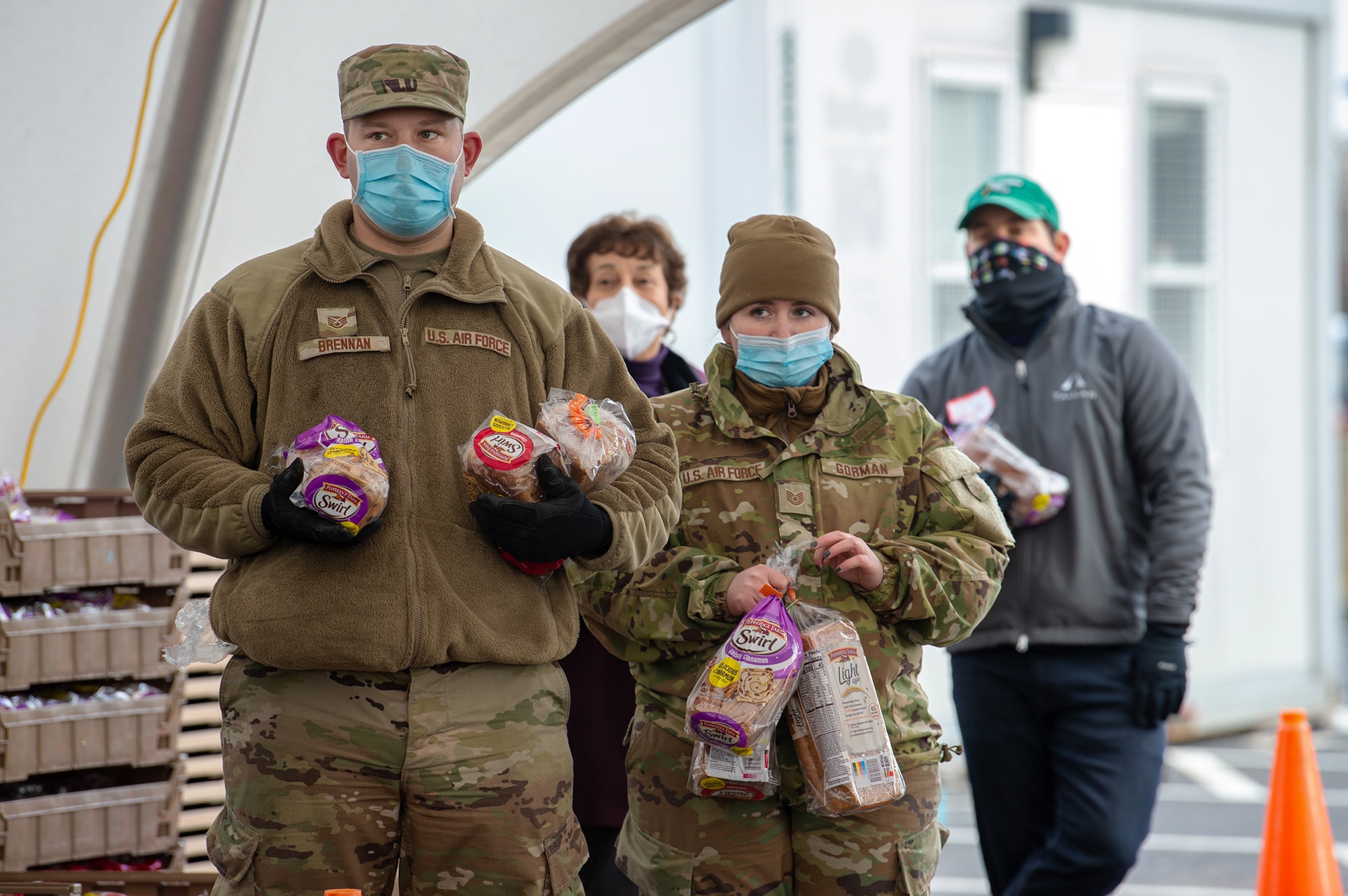 Staff Sgt. Corey Brennan (left) and Tech Sgt. Kelsie Gorman (right) with the Connecticut National Guard wait for an approaching car with loaves of bread at Foodshare’s free food distribution site at Rentschler Field in East Hartford Tuesday. The distribution will take place every Tuesday from 9:30 a.m. to 1:00 p.m. for residents of Hartford and Tolland counties. They average serving about 2,000 families each day and have been distributing food since the start of the COVID-19 pandemic. Credit: Cloe Poisson / CTMirror.org