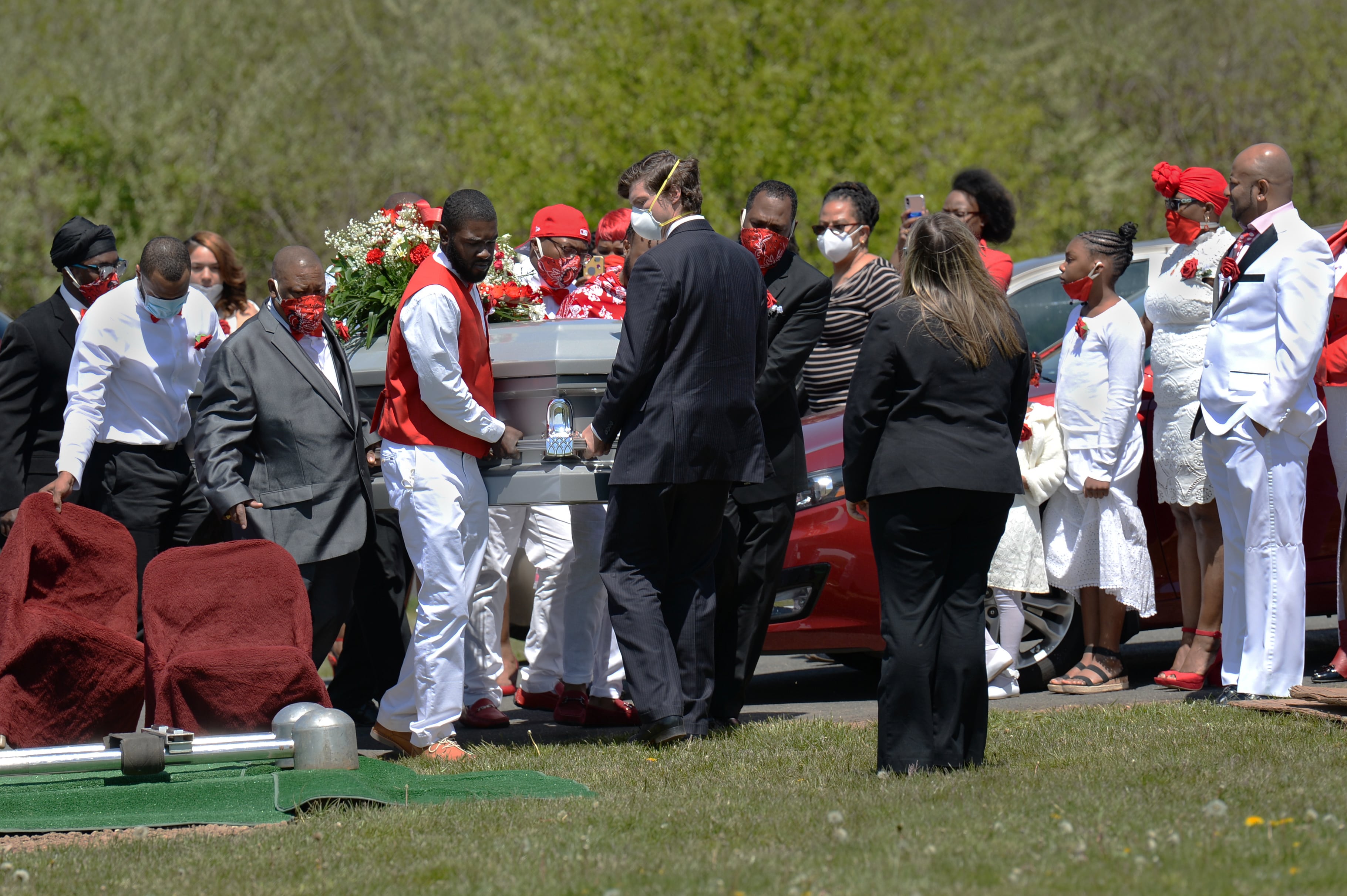 Pall bearers carry Hazel Bailey’s casket to her burial place during a service at Mountain View Cemetery in Bloomfield Thursday, May 14, 2020. Bailey died of COVID-19 on April 19 at age 73. Her daughter, Francene Bailey, (second from right) who works as a certified nurses aid at Kimberly Hall North nursing home, the site of several infected patients and deaths from COVID-19, tested positive for the virus in late March. Although Francene Bailey recovered, she’s convinced that she unwittingly infected her mother. Credit: Cloe Poisson / CTMirror.org