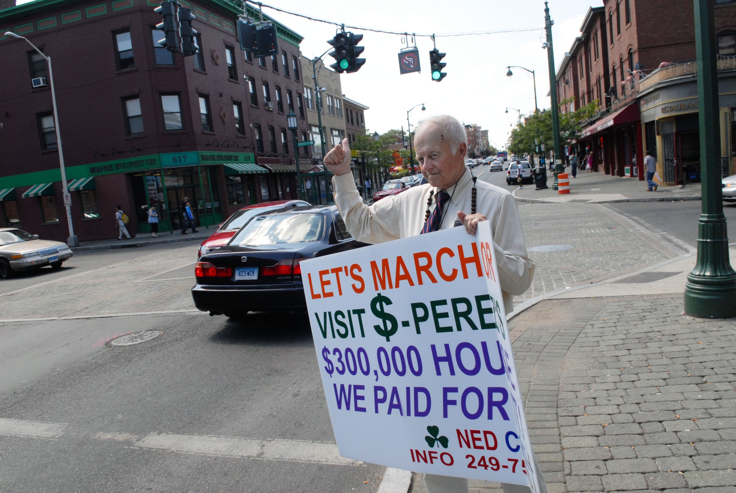 HARTFORD Hartford activist Ned Coll gives a thumbs up to a driver as he protests against Mayor Eddie Perez on Park Street on Aug. 22, 2008. (Courant file photo) Credit: Rick Hartford/The Hartford Courant