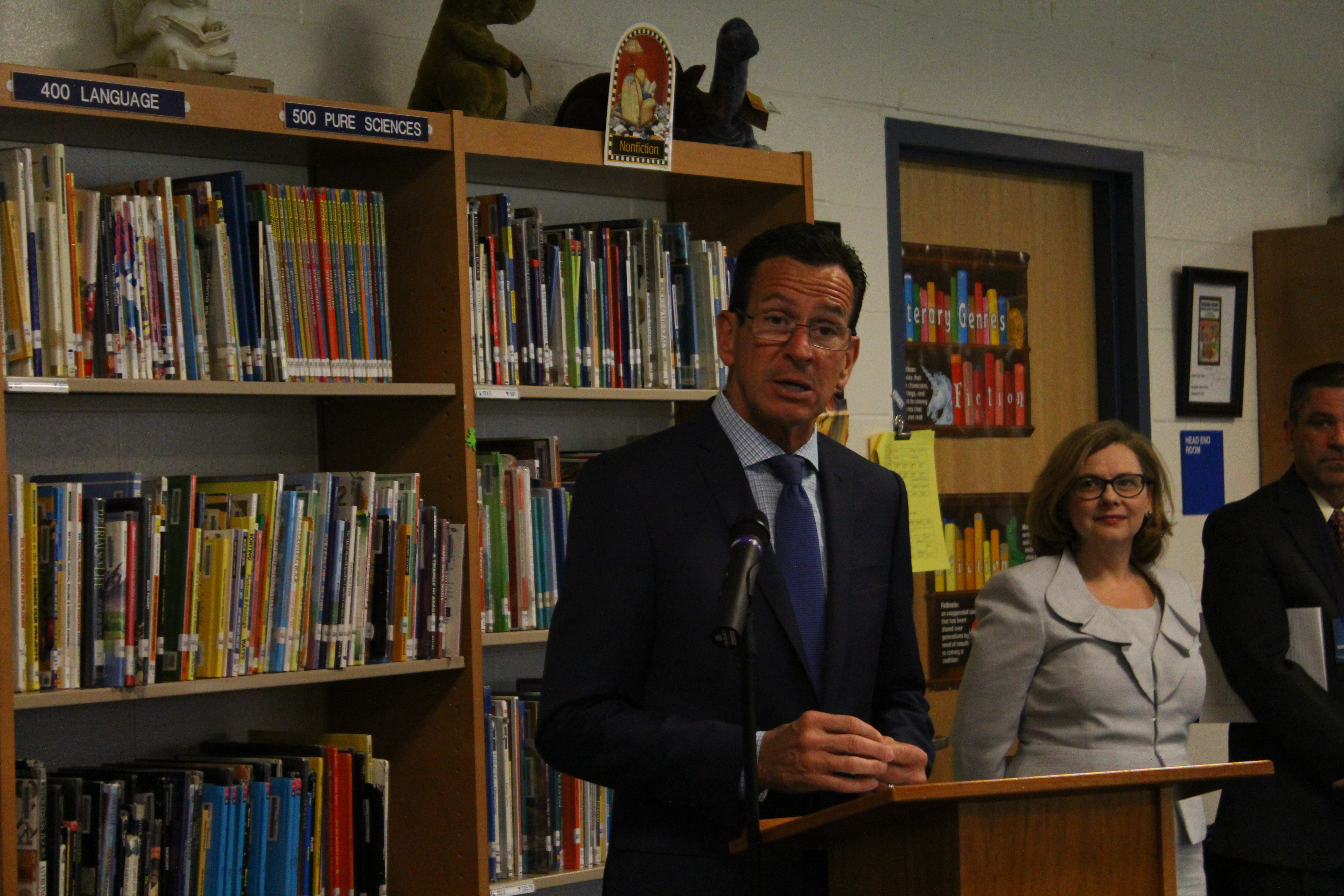 Malloy in a library at an Elementary School in Bristol Credit: CTMirror.org