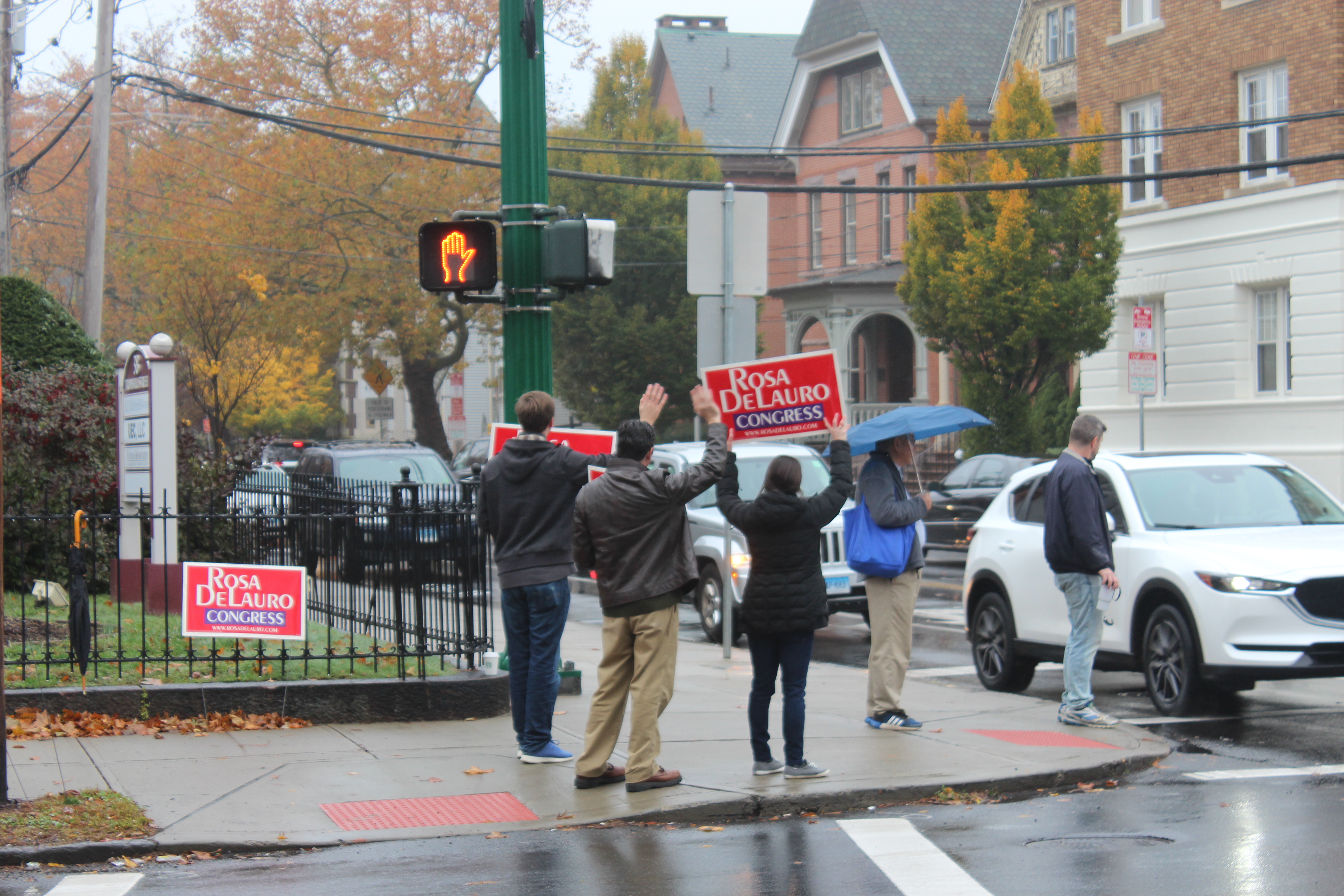 Supporters of U.S. Rep. Rosa DeLaura hold her signs in New Haven on Election Day 2018 Credit: Clarice Silber / CTMirror.org