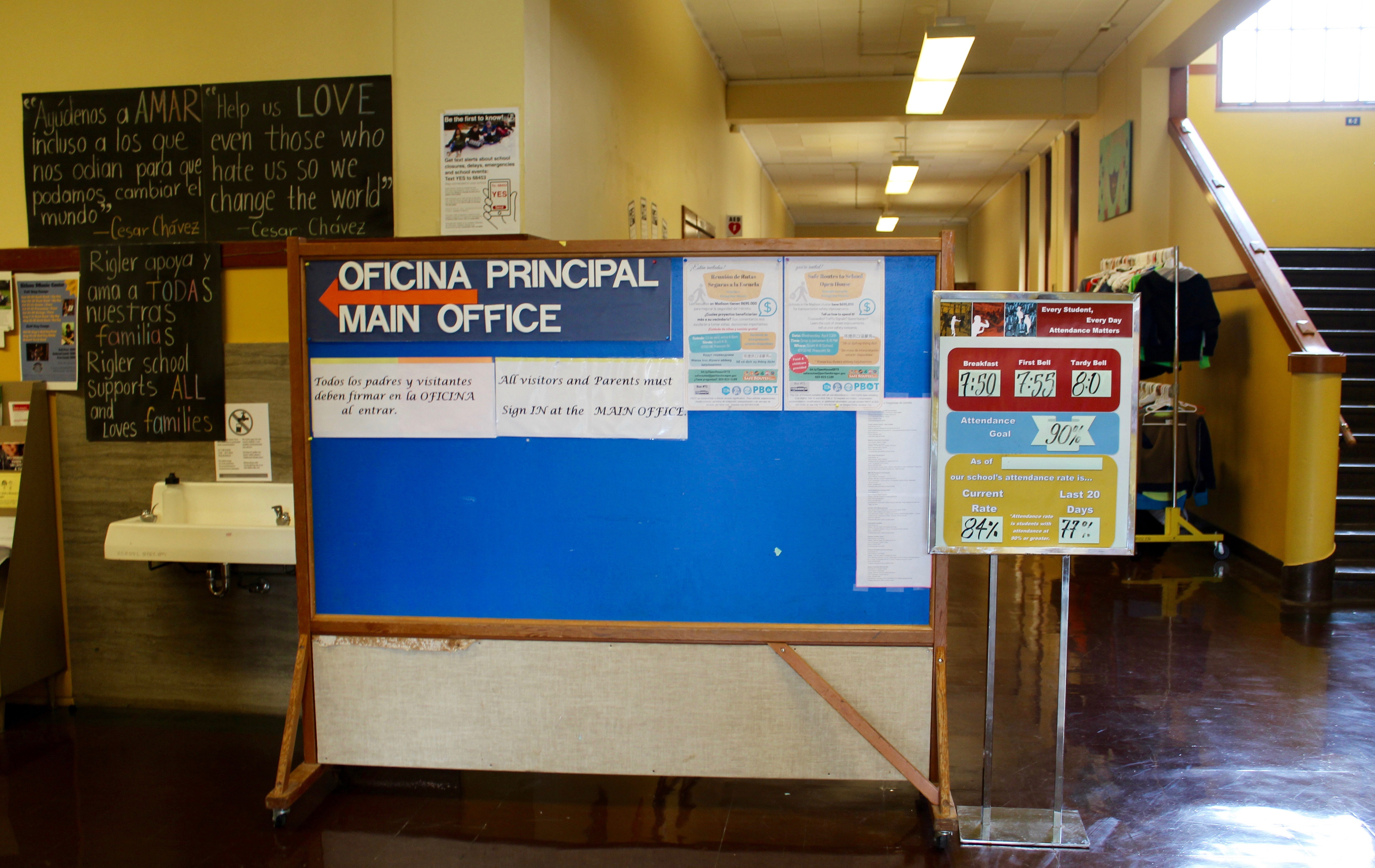 Signs greet students and visitors at the entrance of Rigler Elementary School in Portland. Credit: Jacqueline Rabe Thomas / www.CtMirror.org