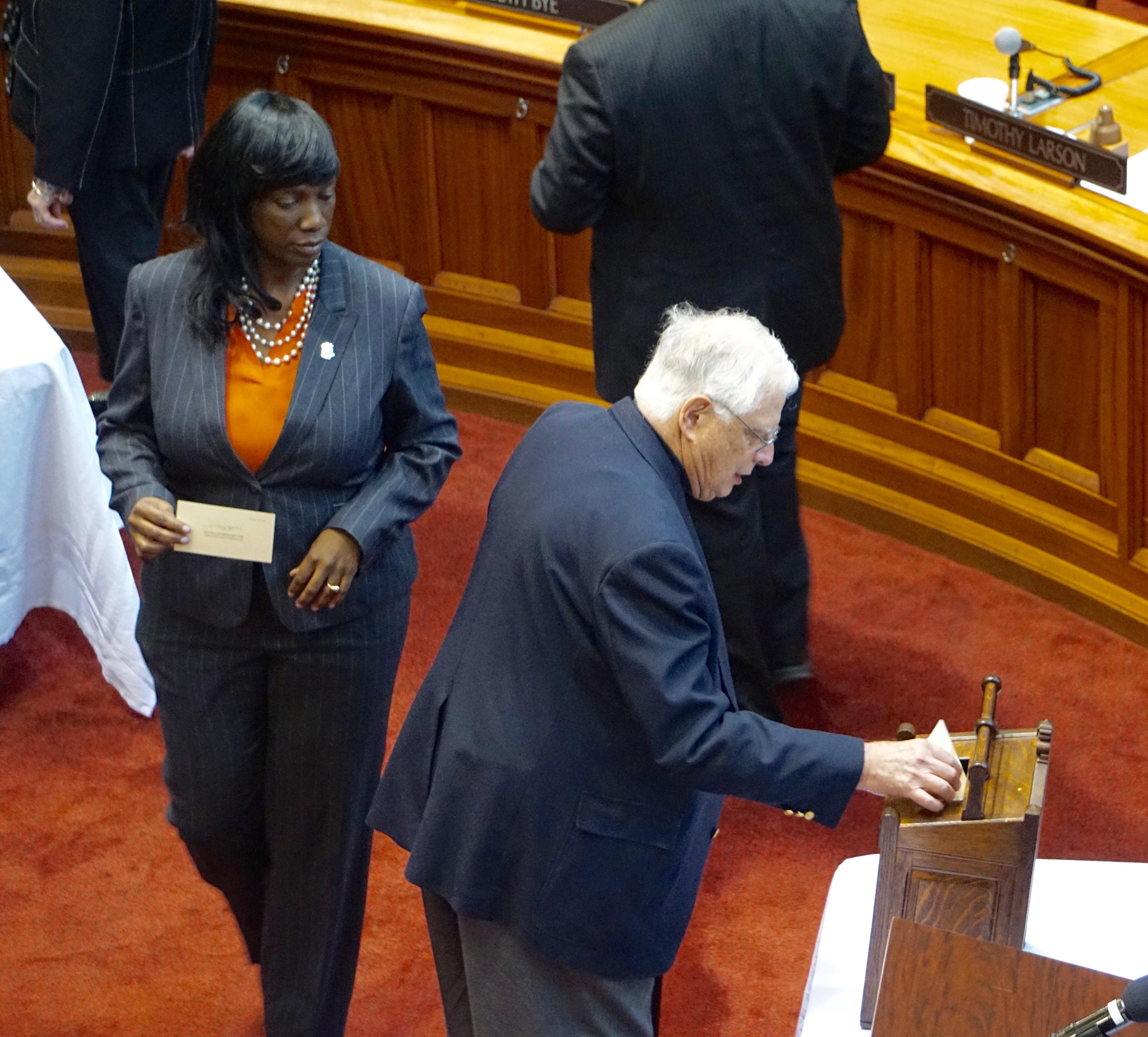 Seven electors dropped signed paper ballots into a wooden box in the state Senate on Monday, casting Connecticut’s seven Electoral College votes for Hillary Clinton and Tim Kaine, the Democrats who carried the state, won the national popular vote and lost the presidency.