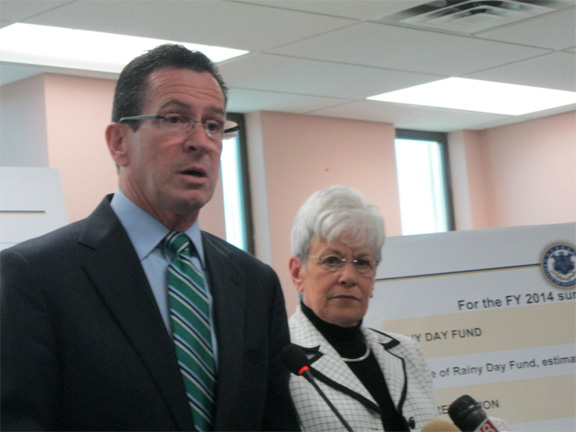 Derby – Gov. Dannel P. Malloy said Thursday he would use the $506 million projected surplus to beef up the state’s fiscal reserves, pay down pension obligations and provide modest tax relief.