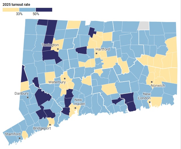 Voter turnout in CT reached 36% in the 2025 municipal elections — higher than Connecticut saw for both the 2021 and the 2023 elections.