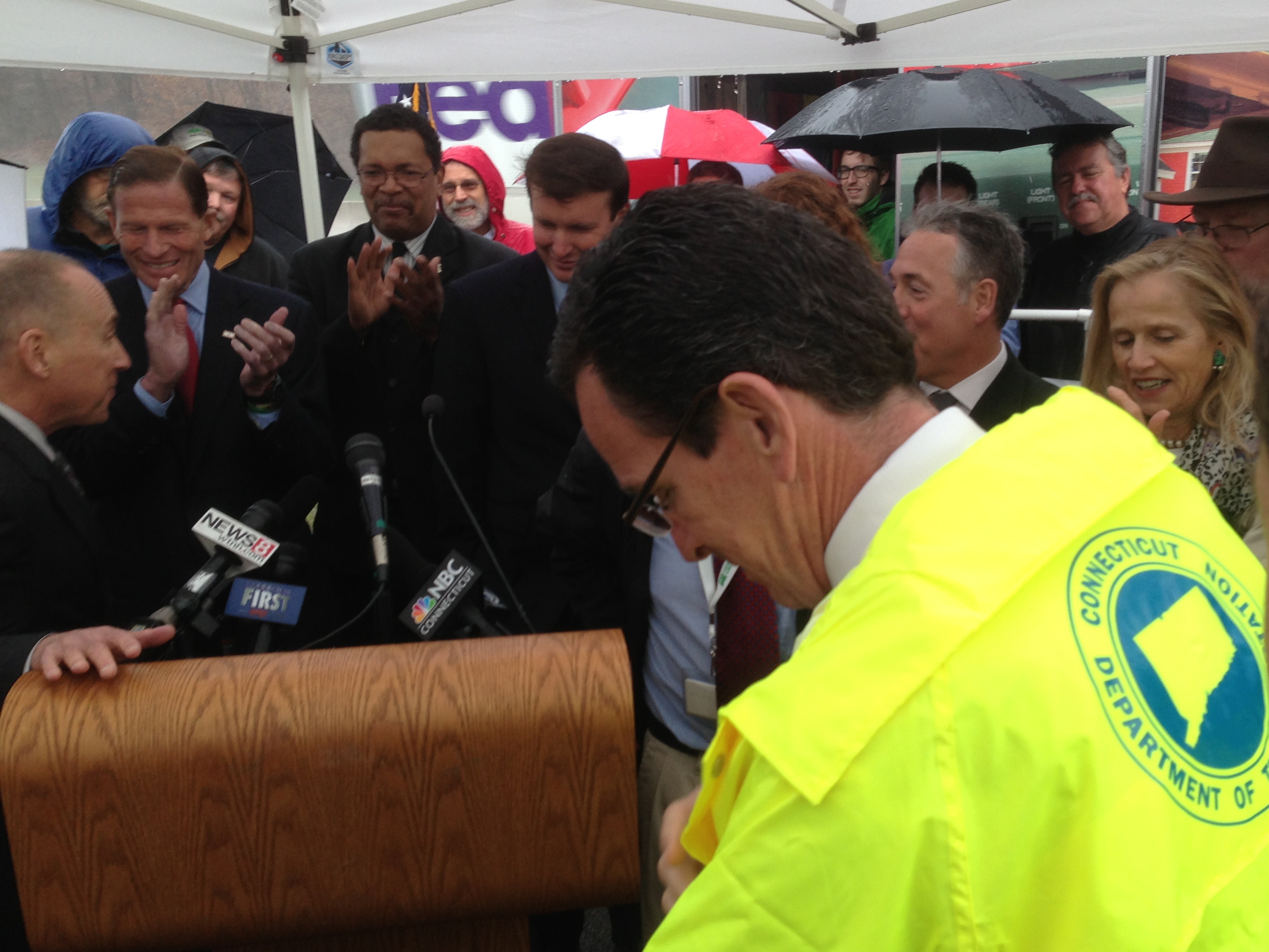 Gov. Dannel P. Malloy flexed the powers of incumbency Tuesday in a rain-swept commuter lot by I-84. Malloy couldn’t stop the rain, but he could command a supportive audience of political, union and business leaders.