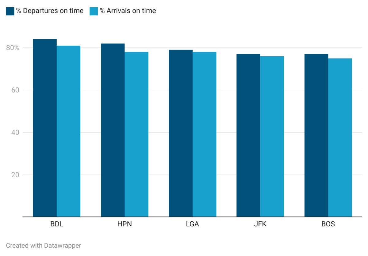 Flights leaving Bradley International Airport are less likely to be delayed than flights leaving other nearby airports, federal data shows.