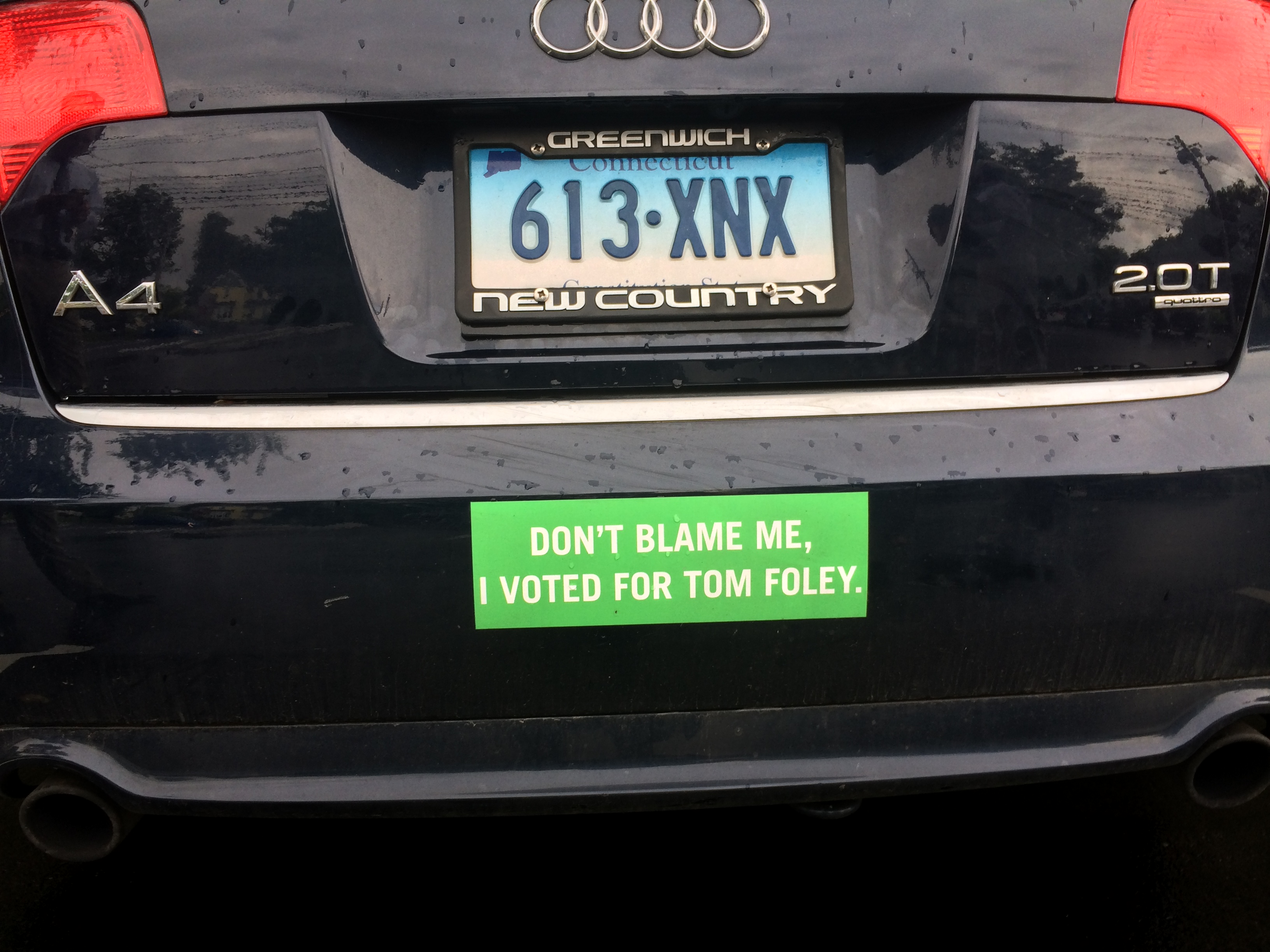 Tom Foley travels to campaign events in a black Audi A4 with a green bumper sticker that says, “Don’t blame me, I voted for Tom Foley.” It’s cute, a little cheeky, even. But the sticker reflects a serious vibe that resonates through Foley’s second run for governor in four years.