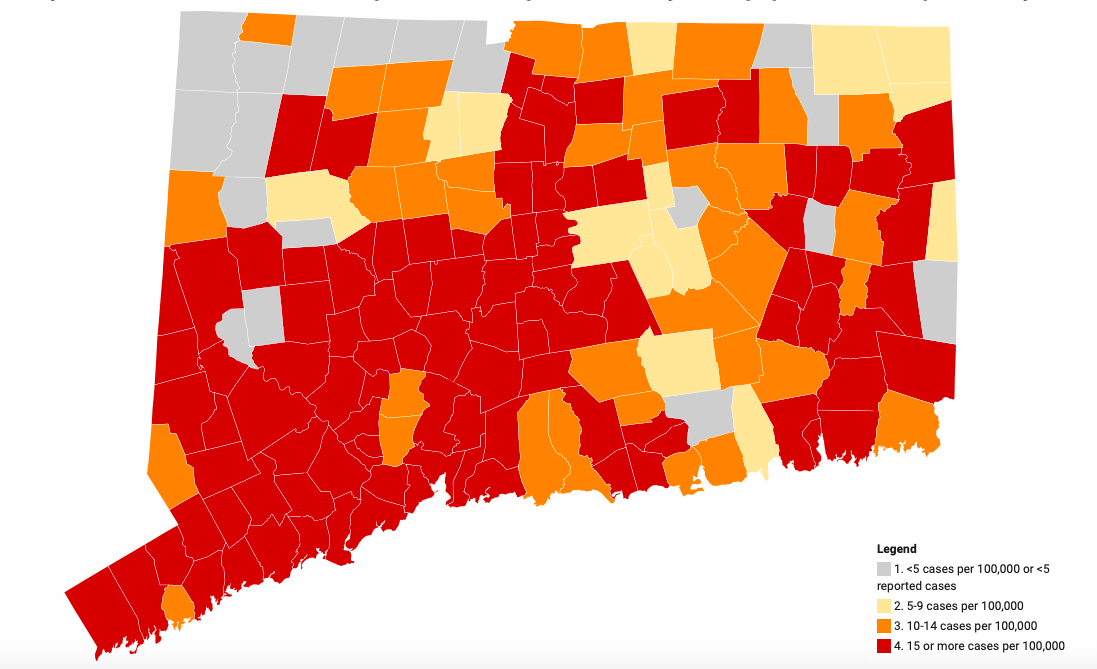 The autumn surge of COVID-19 cases has reached red-alert status in 100 of Connecticut’s 169 cities and towns.