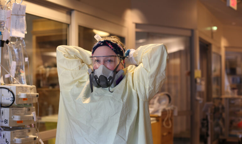 The-ICU-has-returned-to-normal-for-Carol-Laurer-R.N.-of-Naugatuck-CD.jpg-1-771×461 Carol Laurer, R.N. of Naugatuck, suits up in the ICU. Credit: Carol Leonetti Dannhauser / C-HIT.ORG
