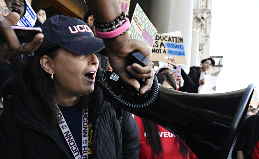 Protests at the state Capitol over proposed state funding for the university on Wednesday, Feb. 15, 2023, in Hartford, Conn. Students boarded buses from the campus in Storrs after walking out of classes to protest funding levels in Gov. Ned Lamont’s proposed state budget.