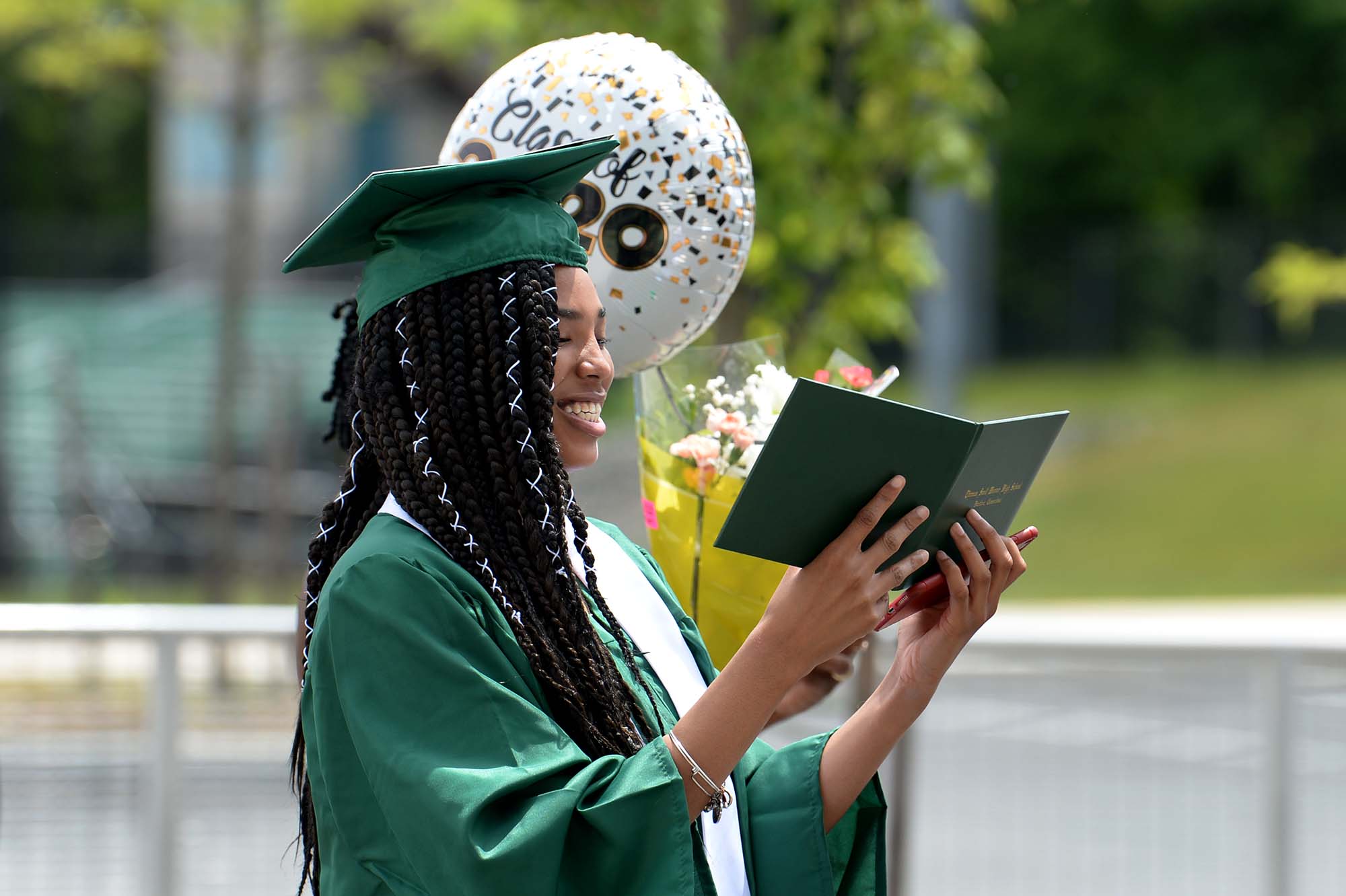 A proud Hartford graduate looks at her diploma at Weaver High School’s drive-up commencement ceremonies, June 15, 2020. Credit: Cloe Poisson / CTMirror.org